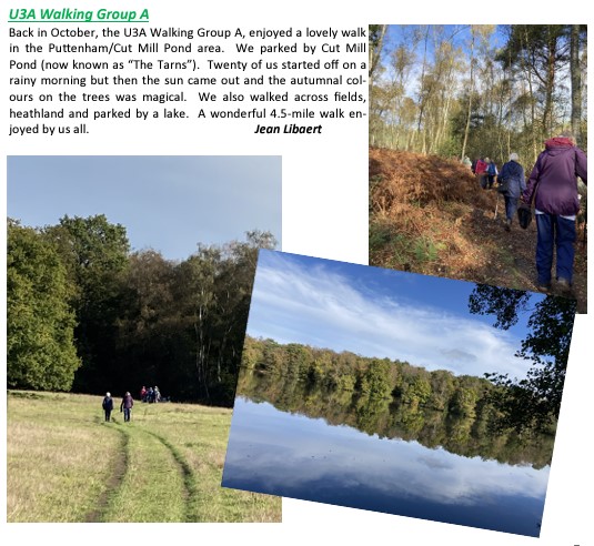 If you like walking, or want to try it, one of our three groups might be for you. The groups are popular, so we sometimes have a waiting list, but do let us know if you’re interested. Most walks begin at 10am on Fridays and we try to make the start no more than a 45 minute drive from Fleet. Our walks are usually in rural areas and, in the winter, mud can be expected on some paths. No special clothing is required, but you will need a pair of boots or shoes designed for walking. Two groups, A and B, undertake walks every two weeks of around 8 to 10 kilometres (5 to 6 miles), taking between 2 and 2½ hours, occasionally with some climbs and often with stiles.